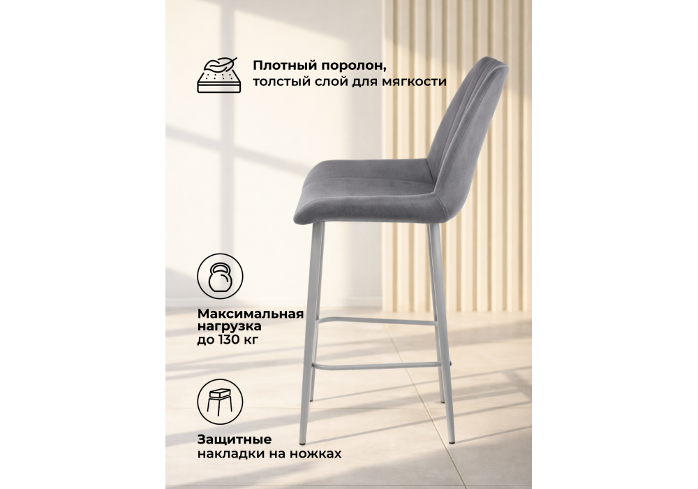 Материал каркаса - металл; Материал сиденья - велюр; Материал обивки - велюр; Цвет ножек - серый; Ширина - 49; Глубина - 57; Высота - 102; Ширина сиденья - 47; Глубина сиденья - 41; Высота сиденья - 63;