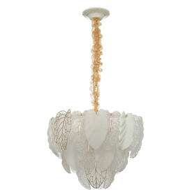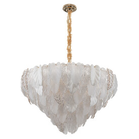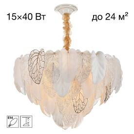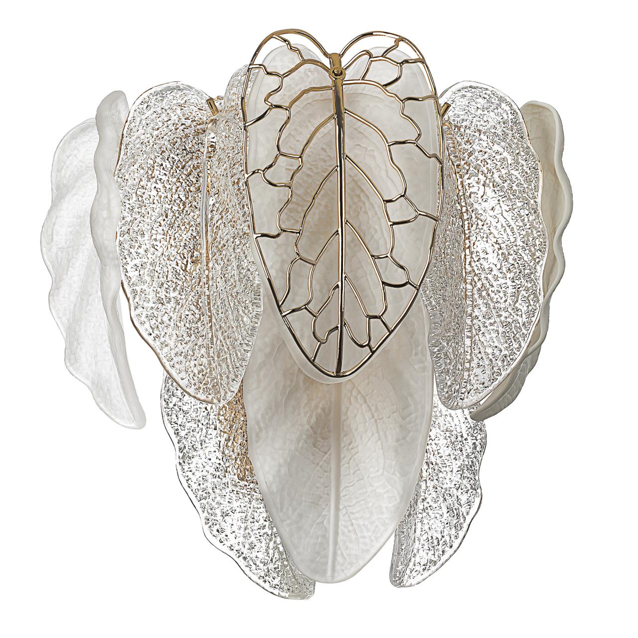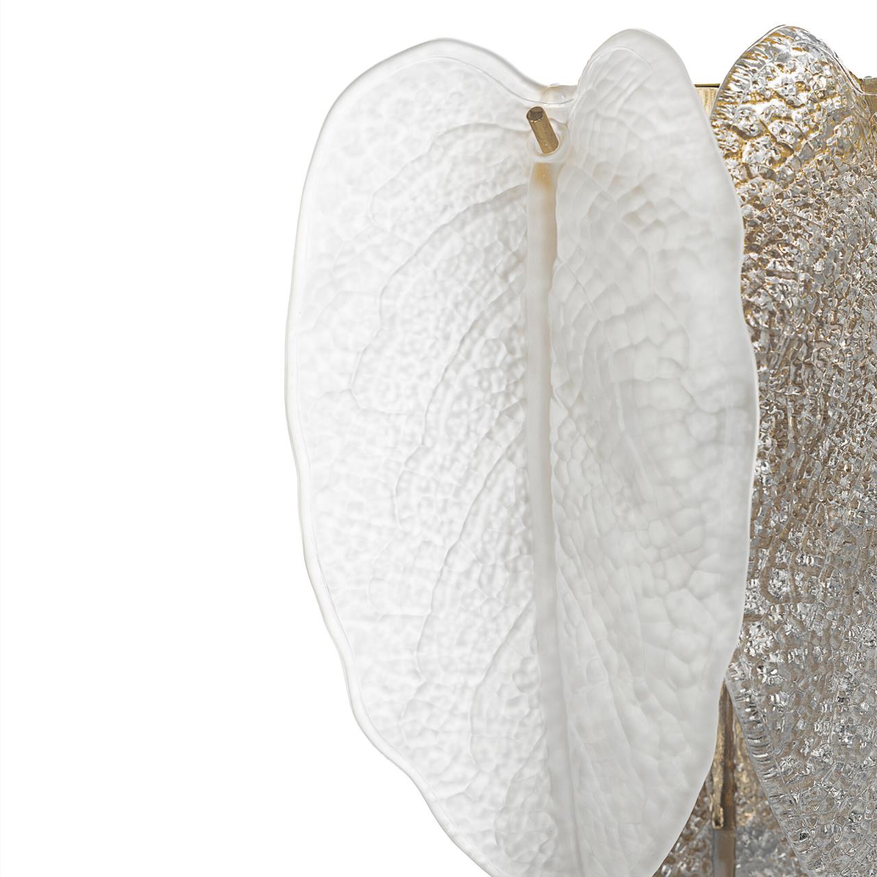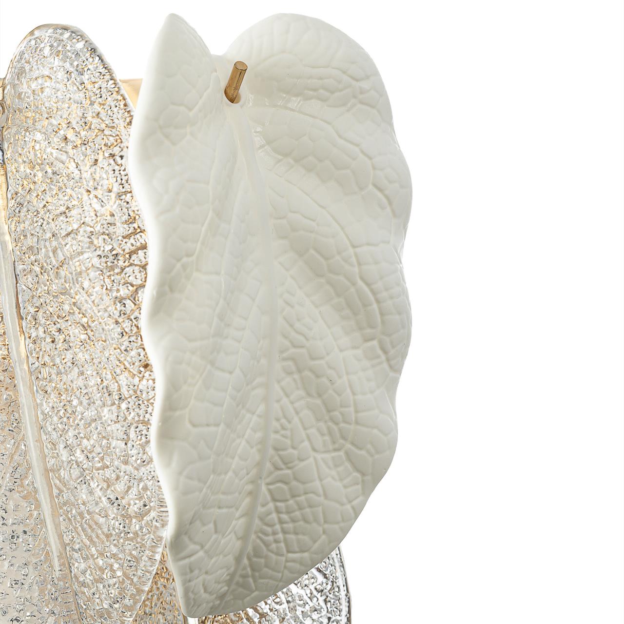 Металлический каркас золотистого оттенка переливается в лучах света, вступая в гармоничный союз с листьями из матового и прозрачного стекла и керамики. Металлические листья-подвески отлиты по ювелирной технологии, что подчёркивает изысканность и чёткость флористического рисунка. В изделии используется 5 лампочек с цоколем G9, тип крепления светильника — планка.