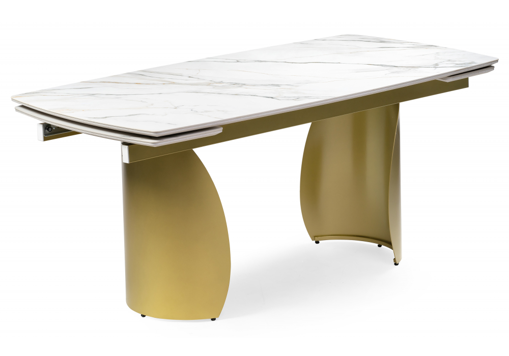 Расстояние между ножками: 80 см.Толщина столешницы: 2 см. Материал каркаса - Металл; Материал ножек - Металл; Материал столешницы - Керамика / МДФ; Цвет каркаса - Золотой; Цвет ножек - Золотой; Цвет столешницы - Белый; Ширина - 90; Высота - 79; Длина стола в разложенном виде - 240; Длина - 180.Стол поставляется в двух упаковках -Размер упаковки 1: 1900х100х135 , Размер упаковки 2: 770х530х290 . Данную модель 588029 с быстрой доставкой спешите купить в магазине 220svet.ru