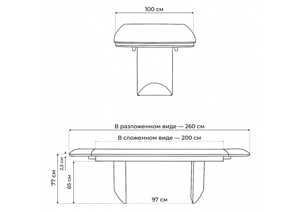 Толщина столешницы: 2,5 см. Материал каркаса - металл; Материал столешницы - Керамика; Ширина - 100; Высота - 77; Длина стола в разложенном виде - 260; Длина - 200;