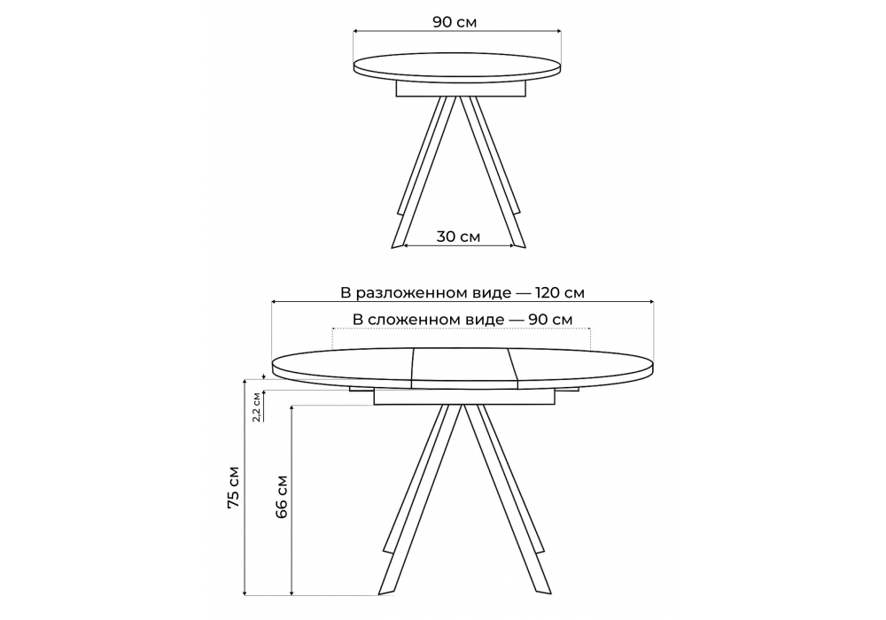 Материал каркаса - металл; Материал столешницы - Керамика; Ширина - 90; Высота - 75; Длина стола в разложенном виде - 120; Длина - 90;