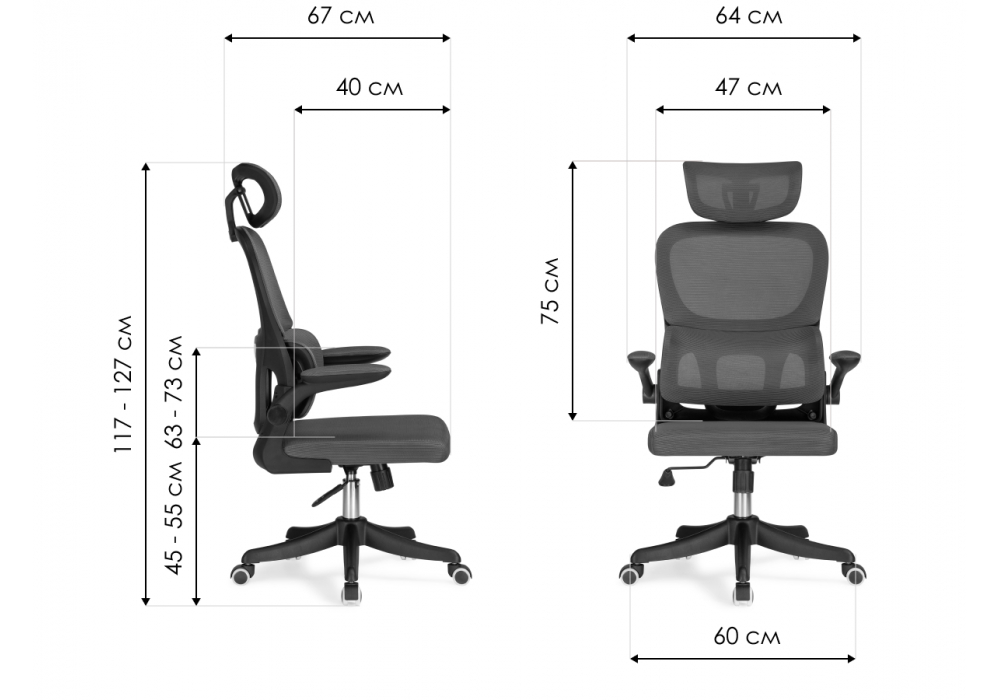 Материал каркаса - пластик; Материал сиденья - сетка; Материал обивки - сетка; Ширина - 64; Глубина - 67; Высота - 117; Ширина сиденья - 47; Глубина сиденья - 40; Высота сиденья - 45; Высота спинки - 75; Высота максимальная - 127;