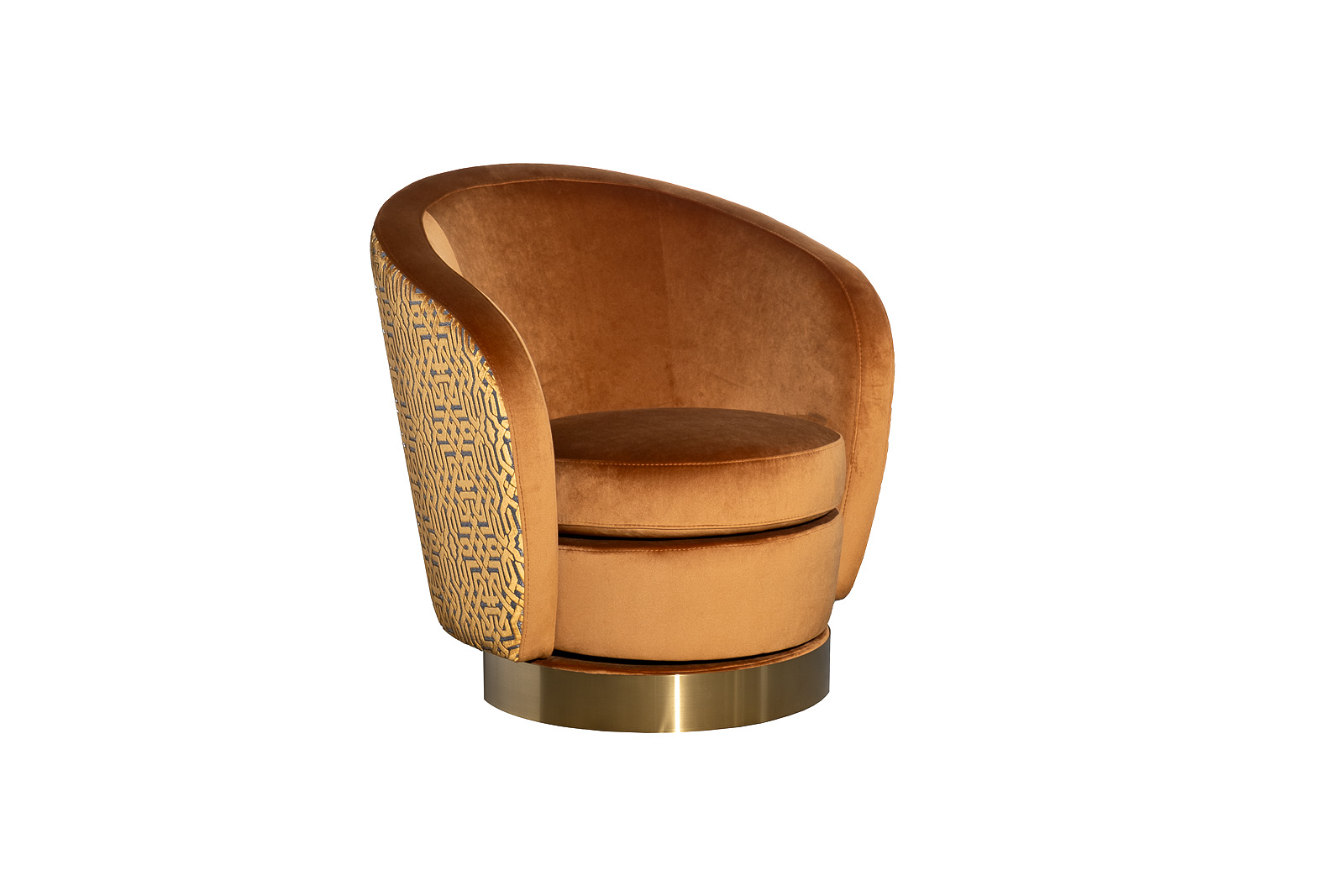 В стандартном исполнении: обивка в ткани велюр Паддингтон(Paddington)32 - внутренняя часть кресла, внешняя сторона спинки вельвет из коллекции Garda Decor- Геометрия-ОРАНЖ(Latt-ORANG), основание - матовое золото, без декоративной поду...