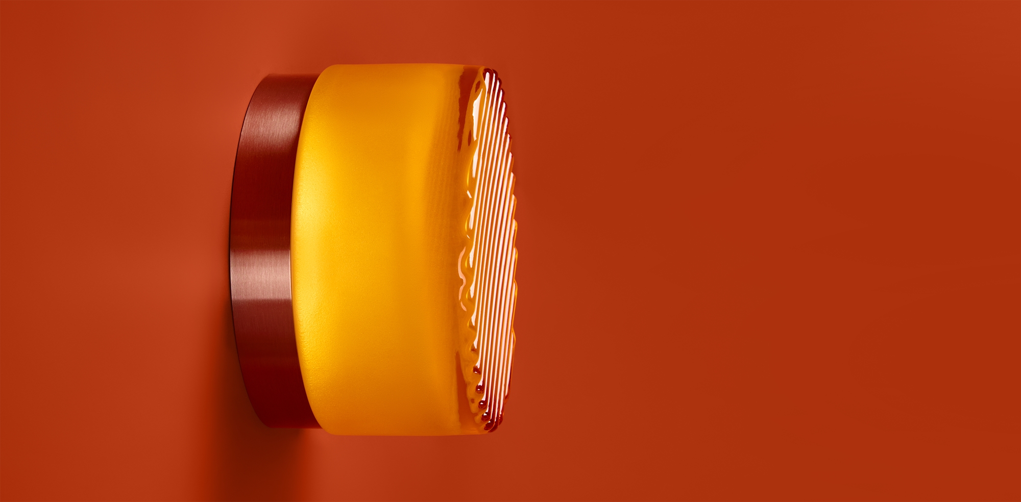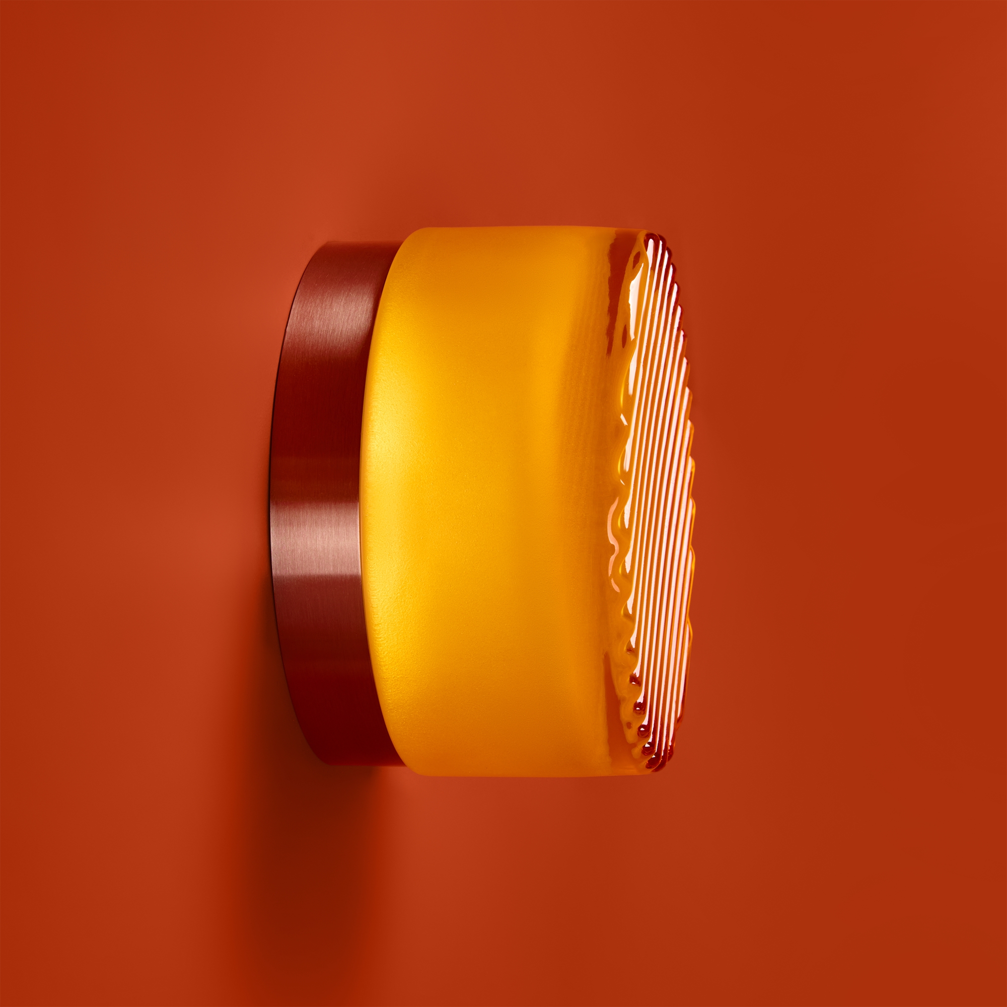 Металлическая арматура в цвете никель в трех рельефных основаниях. Плафоны, выполненные в приглушенно пшеничном и янтарном оттенках, доступны в двух размерах. LED источник света 2400К/2550К/3000K.
