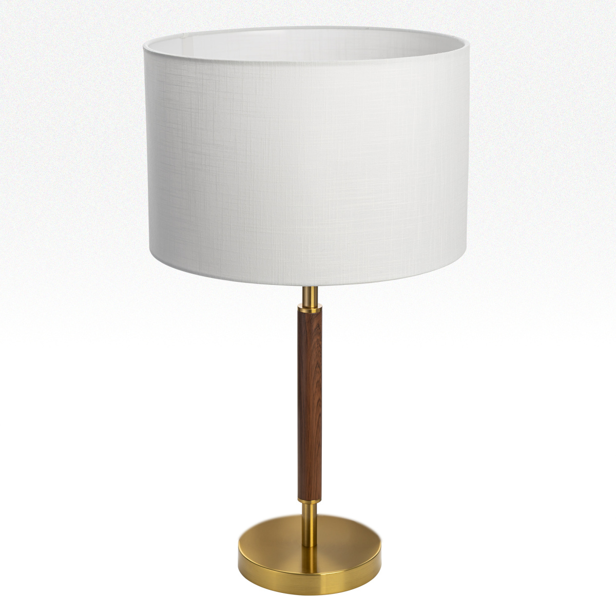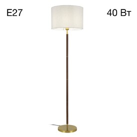 Бронзовый металлический каркас с декоративными элементами с текстурой под дерево. Абажур — в форме цилиндра, изготовленный из молочно-белой ткани с чуть шероховатой текстурой.