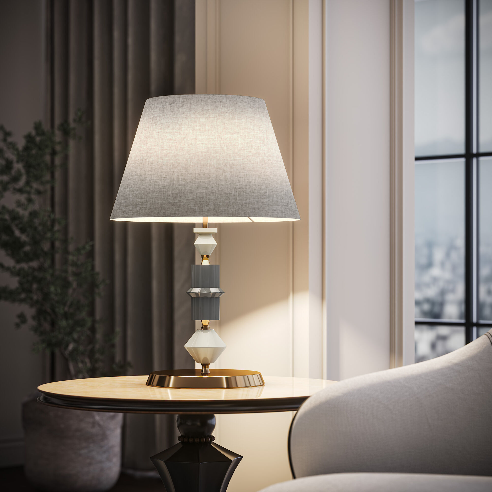 Настольная лампа 108012 с абажуром из ткани создаст приятное и нежное освещение в вашей спальне, гостинной или даже в прихожей. Сочетание геометрических форм из керамики с деликатной латунной арматурой создает стильный акцент в любом интерьере.