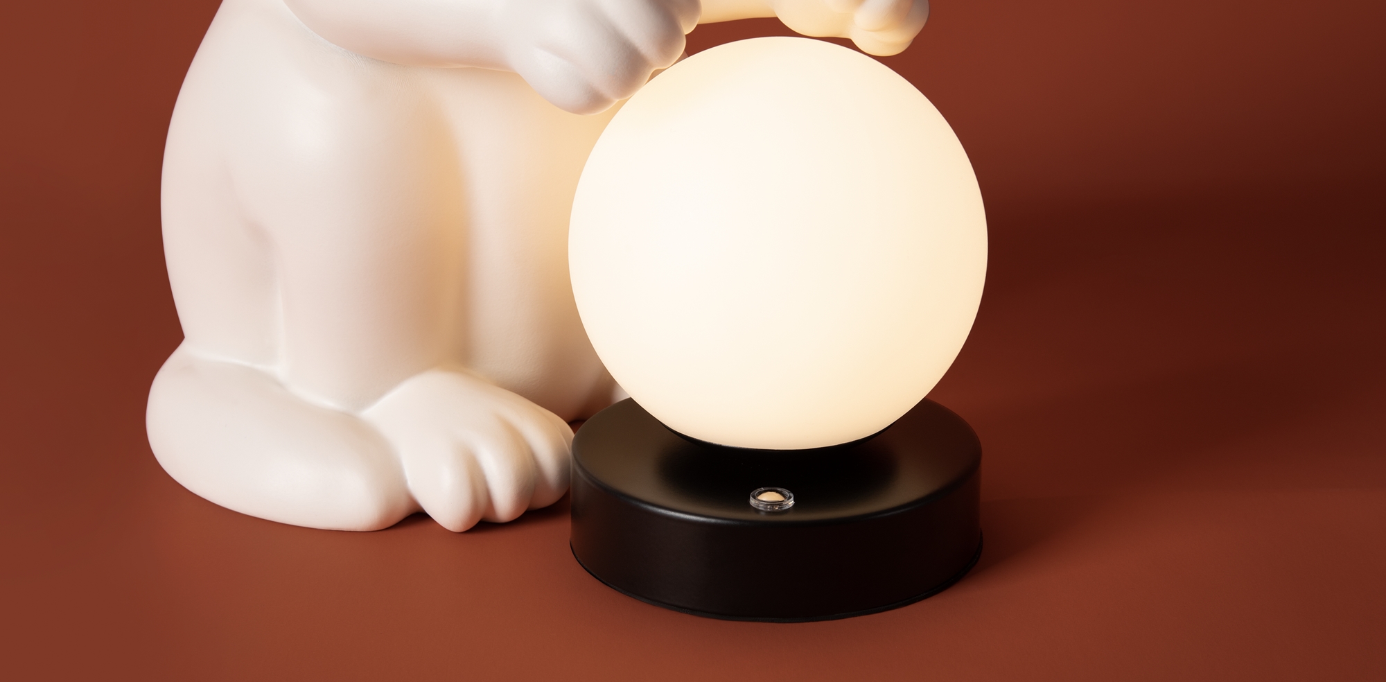 Арматура — полирезин. Абажур из белого матового пластика, форма сферы. Интегрированный LED источник света 3000К. Высота 270 миллиметров. Сенсорное управление. Фигурка котика (RAL 9001) в комплекте.