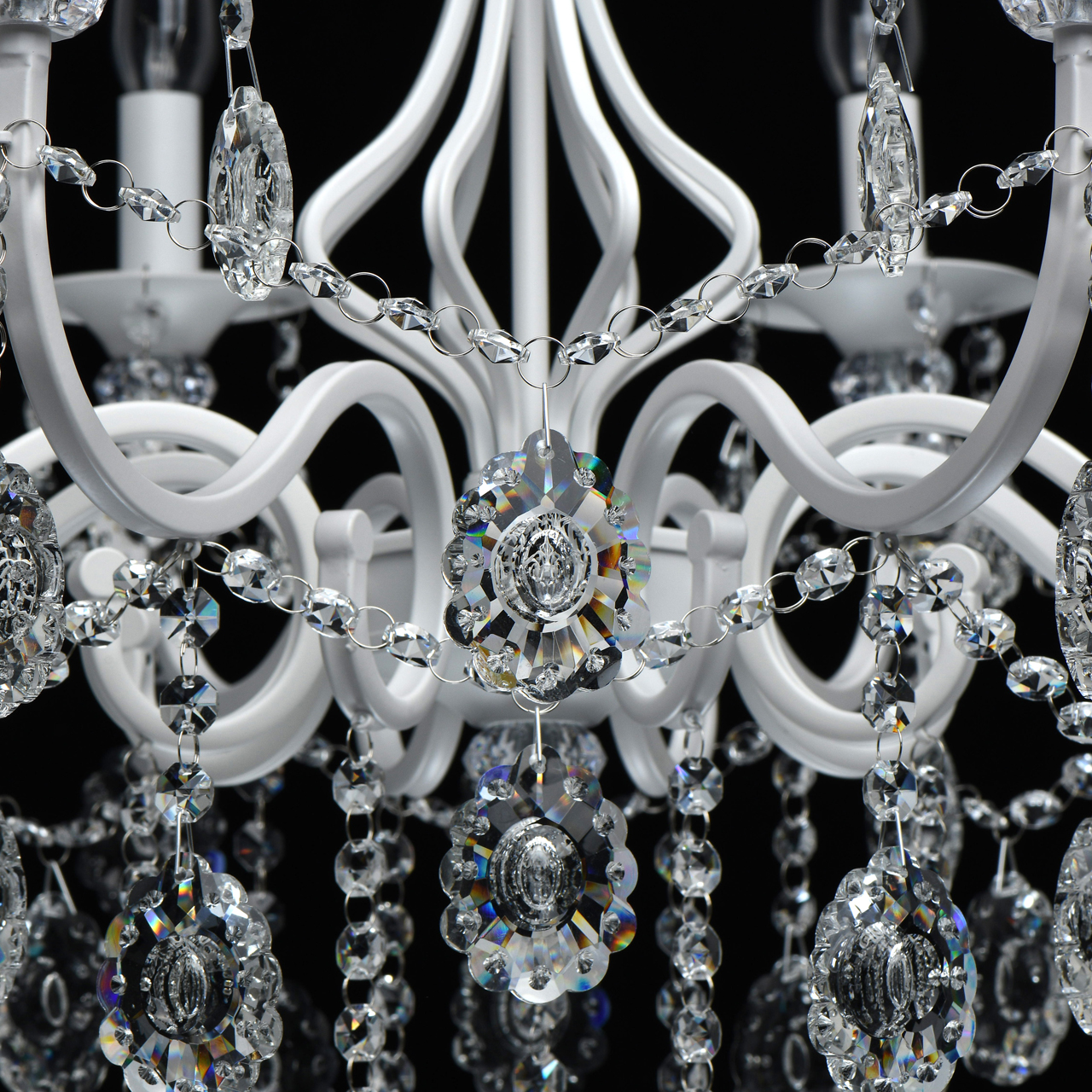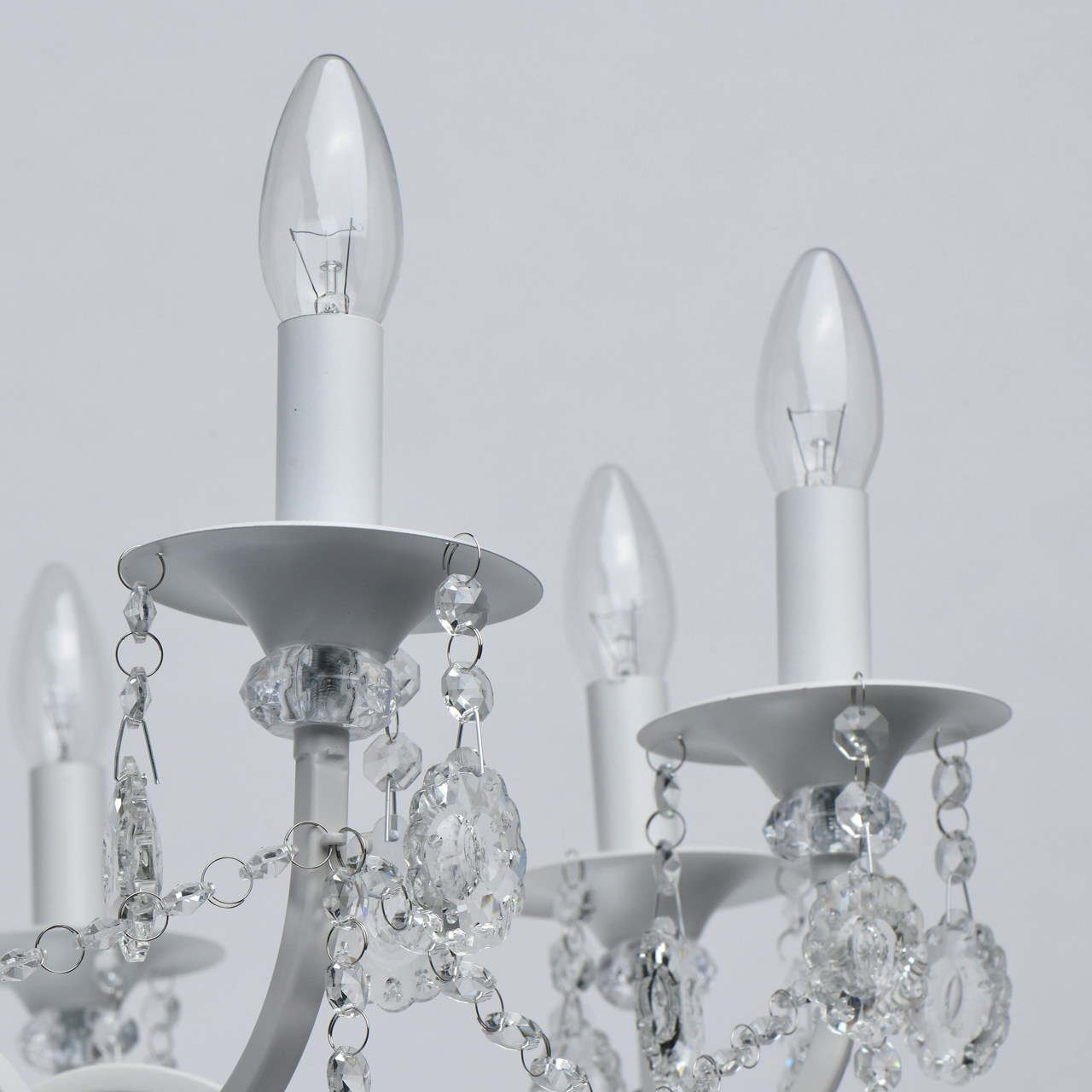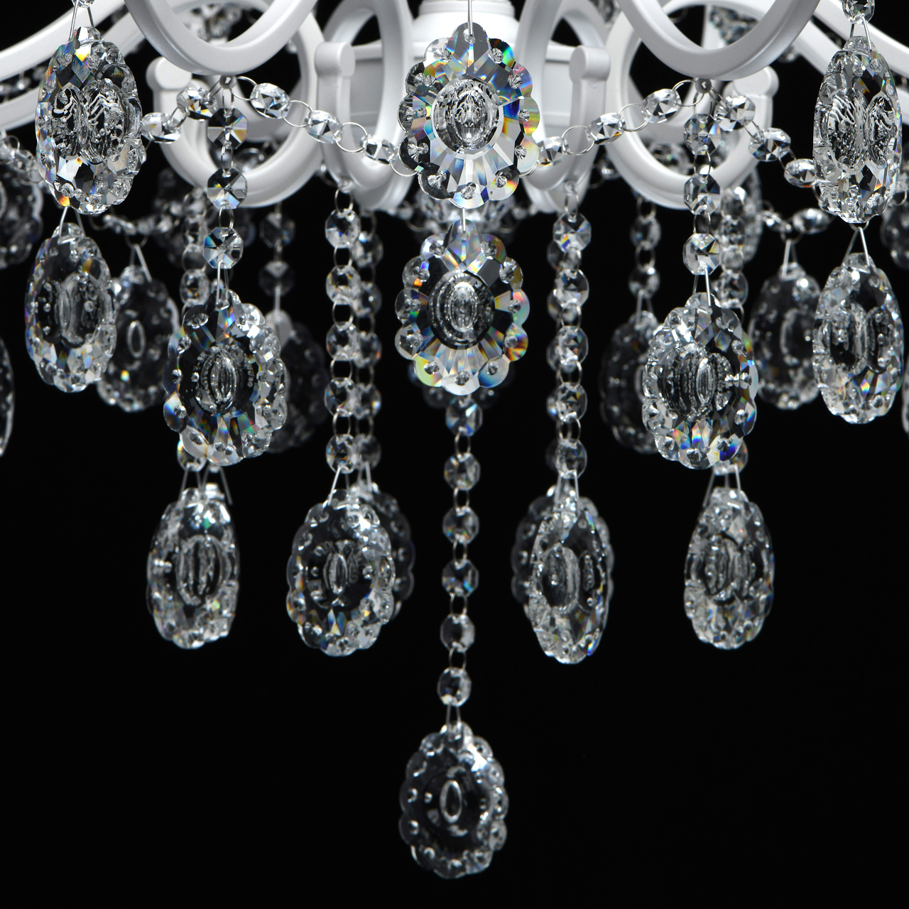Классическая форма рожков-свечей с основанием белого цвета художественной формы.Хрустальные подвески оригинальной формы, цепочки из прозрачных хрустальных октагонов обеспечивают игру света.Массив хрусталя украшает розетки и создает дополнительный акцент.