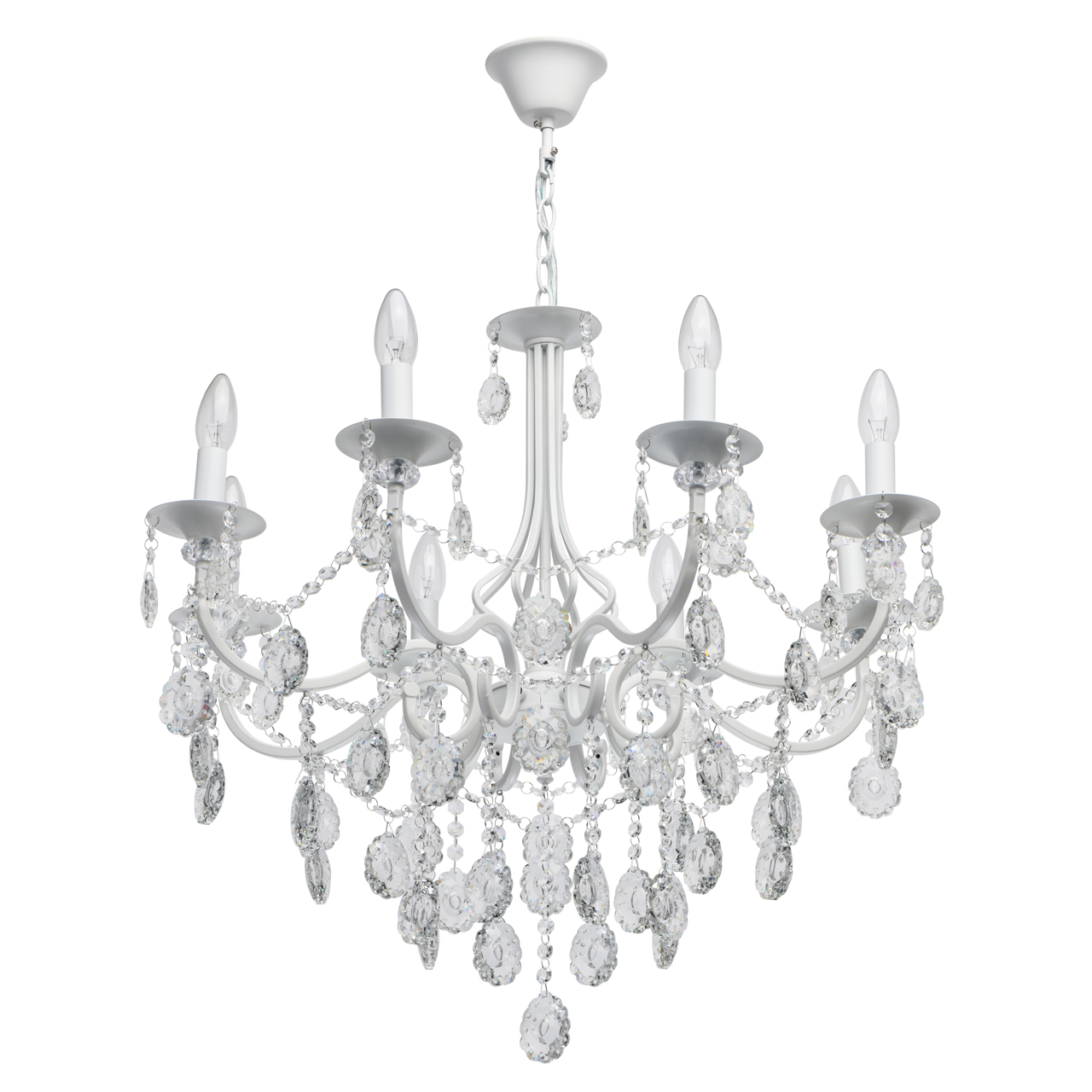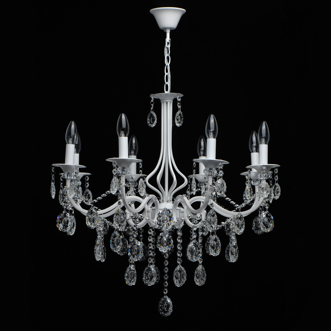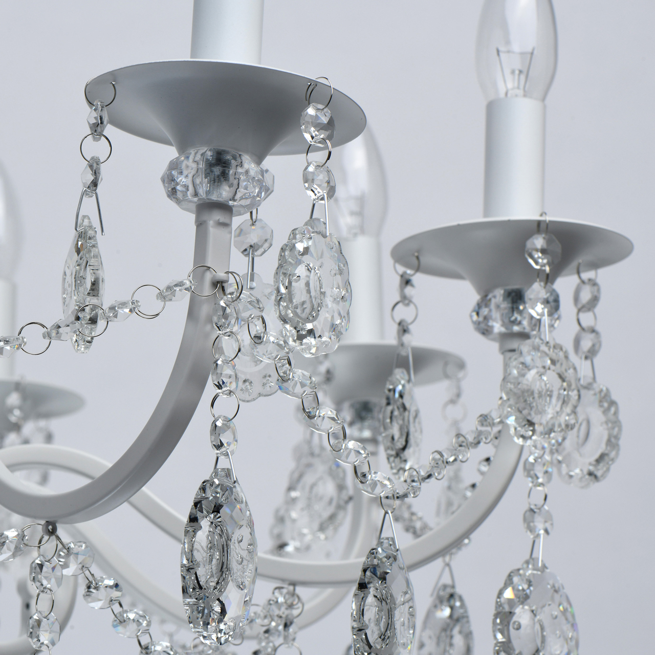 Классическая форма рожков-свечей с основанием белого цвета художественной формы.Хрустальные подвески оригинальной формы, цепочки из прозрачных хрустальных октагонов обеспечивают игру света.Массив хрусталя украшает розетки и создает дополнительный акцент.