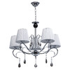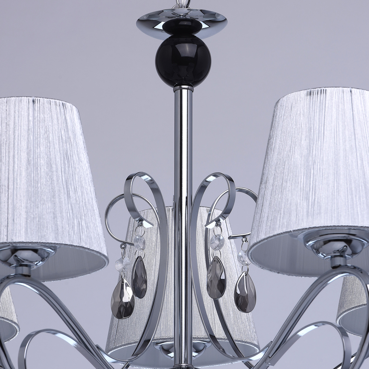 Основание светильника выполнено из металла и гальванизировано в цвет хрома. Рожки и декоративные элементы изящно изогнуты по технологии проката на роликовом станке. Центральный стержень светильника декорирован массивом из хрустального стекла, окрашенного в массе в черный цвет. Абажуры: выполнены из текстильных нитей стального цвета с термостойким акрилом внутри.Декор: подвески из прозрачного и гальванизированного в цвет антрацит декоративного стекла.