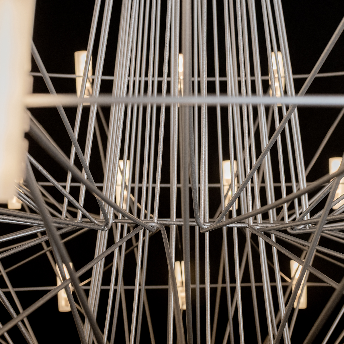Белые цилиндрические плафоны расположены на концах спиц, создавая живой ритм и ощущение динамики, словно свет в любой момент может расплескаться по комнате. Благодаря такому расположению свет мягко раскрывается по всему периметру, подчеркивая архитектуру помещения и создавая уютную атмосферу без резких акцентов.