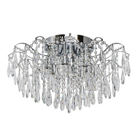 Металлическое основание люстры гальванизировано в цвет хрома. Плафон выполнен из прозрачного фактурного хрустального стекла овальной формы.