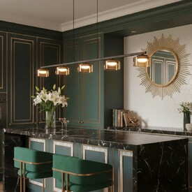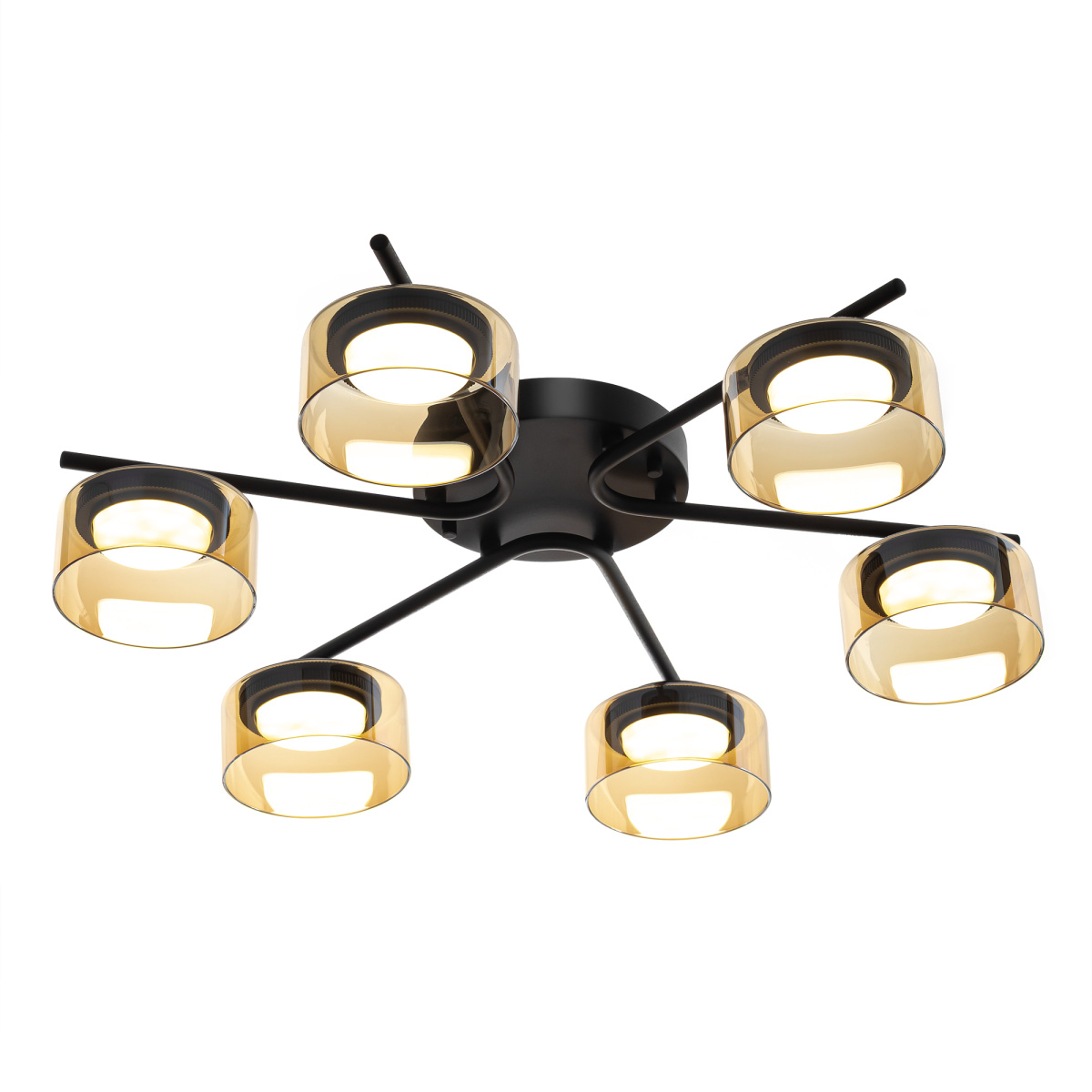 Черный металлический каркас придает люстре сдержанности, а стеклянные открытые плафоны в форме цилиндра с тонировкой оттенка шампань создают игру света и тени, наполняя пространство мягким рассеянным светом. Модель крепится к потолку при помощи планки, в изделии используется шесть LED ламп с цоколем GX53.