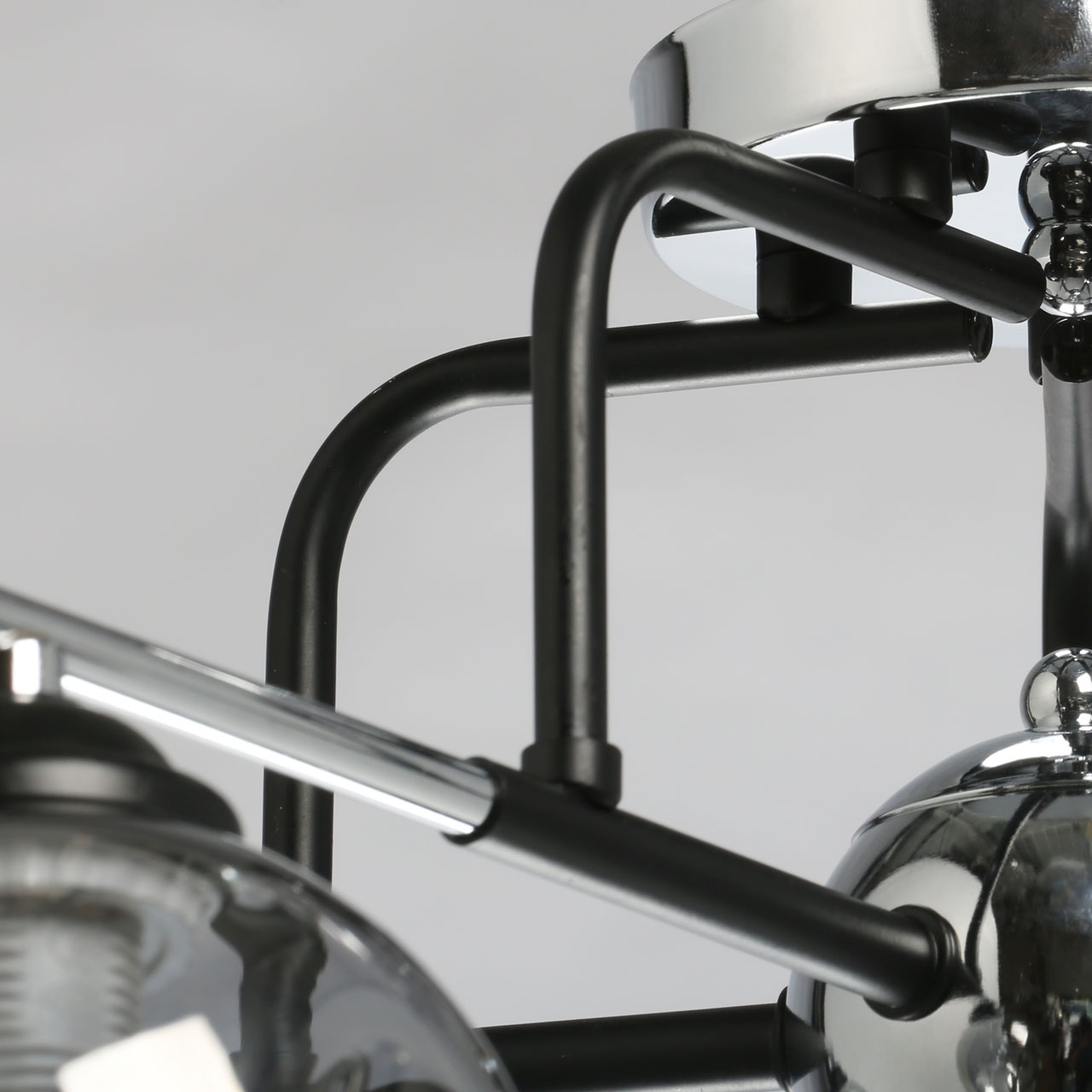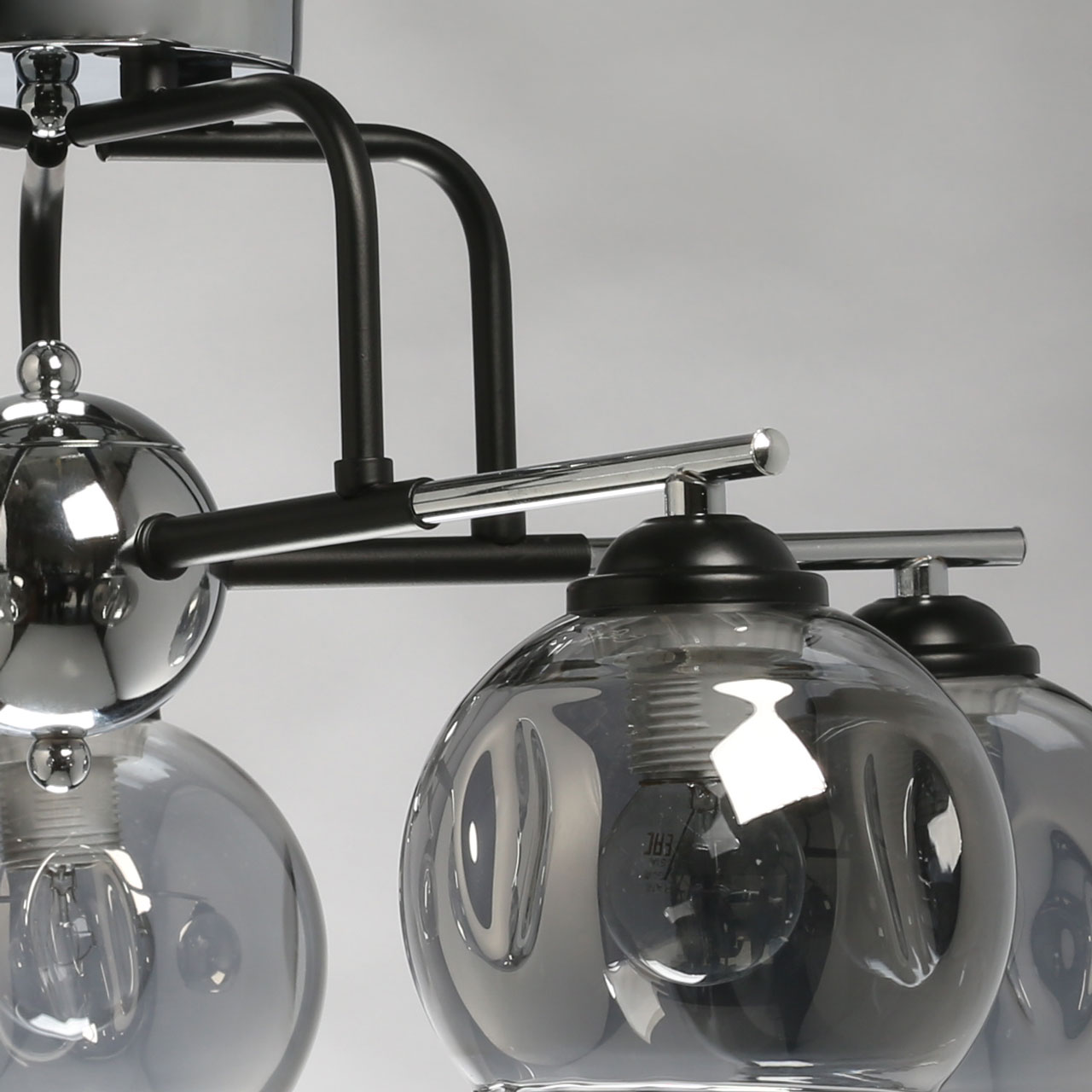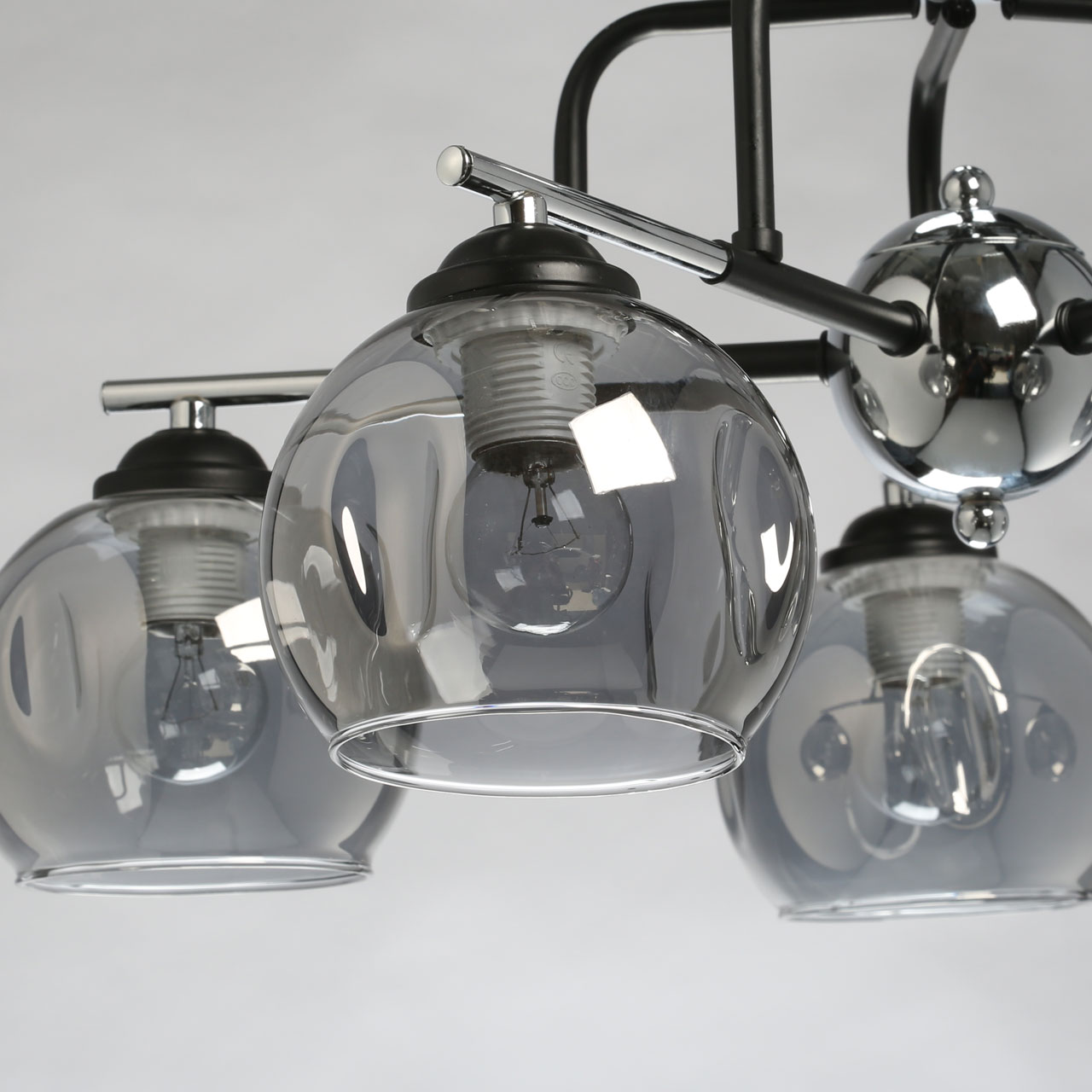 Основание светильника выполнено из металла и гальванизировано в цвет хрома. Рожки и держатели плафонов окрашены в черный цвет. Стеклянные плафоны выдуваются в форму и гальванизированы в дымчатый цвет. Края плафонов оплавлены.
