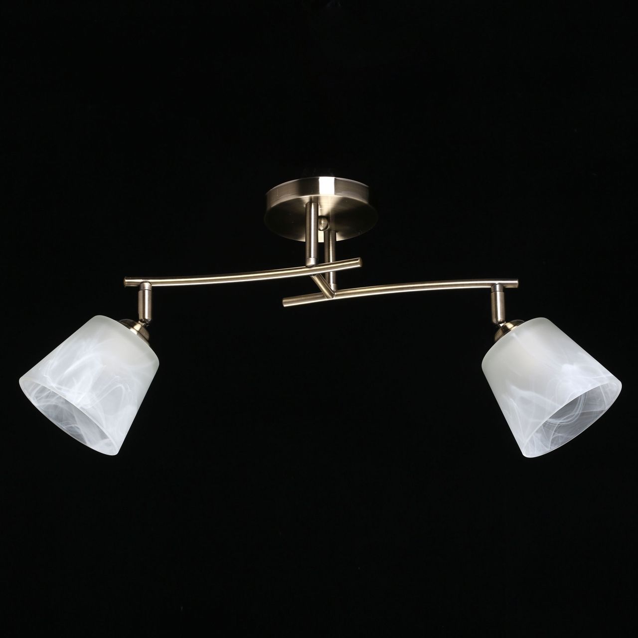 Основание светильника выполнено из металла и гальванизировано в цвет античной бронзы. Светильник декорирован плафонами, выполненными из алебастрового стекла.