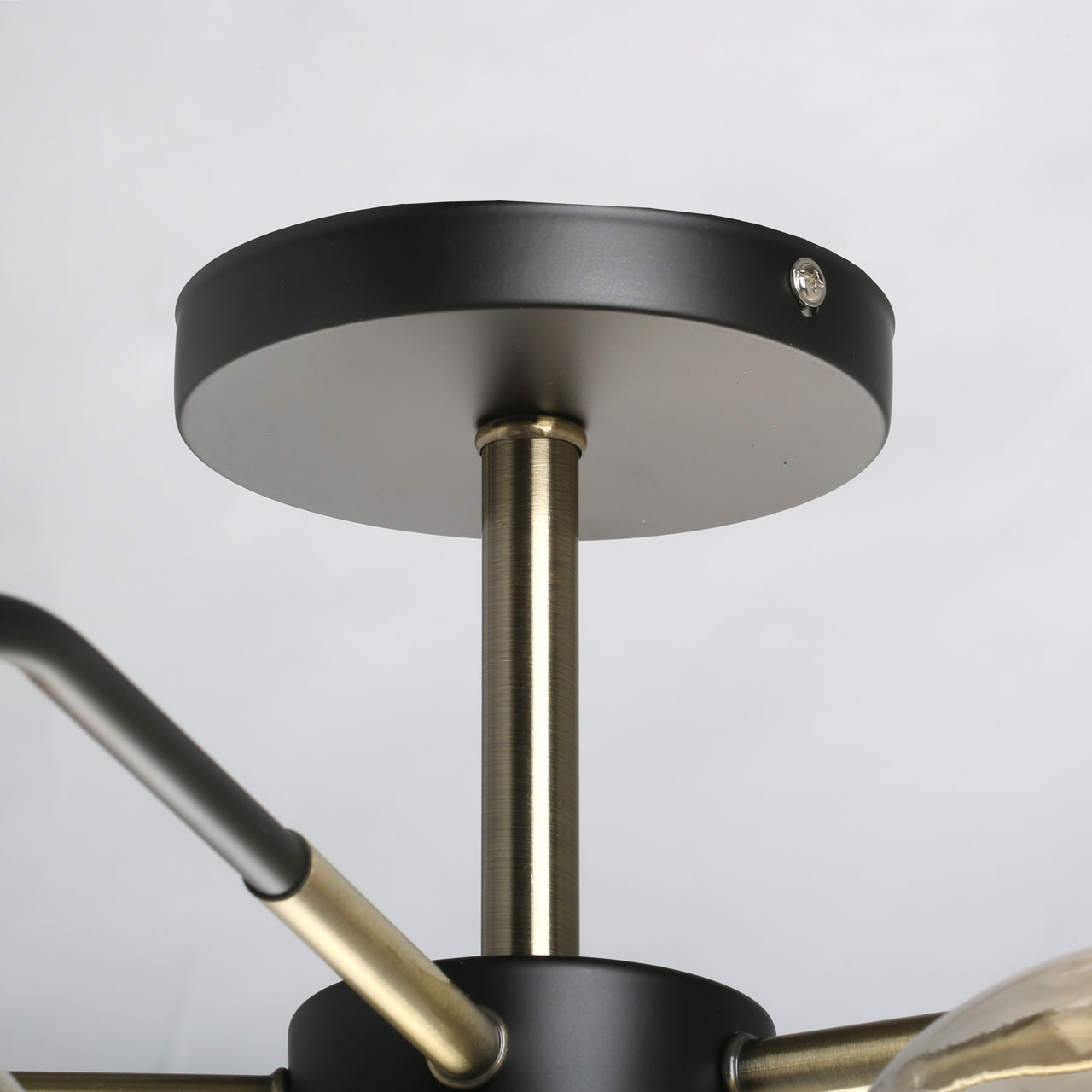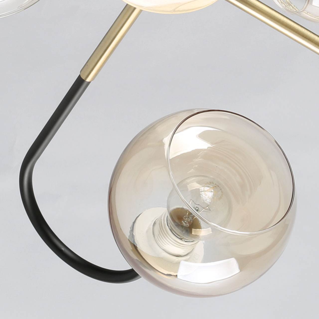 Металлическое основание потолочного светильника окрашено в черный цвет. Отдельные элементы гальванизированы в цвет бронзы. Стеклянные плафоны выдувные в форму гальванизированы в цвет шампань.