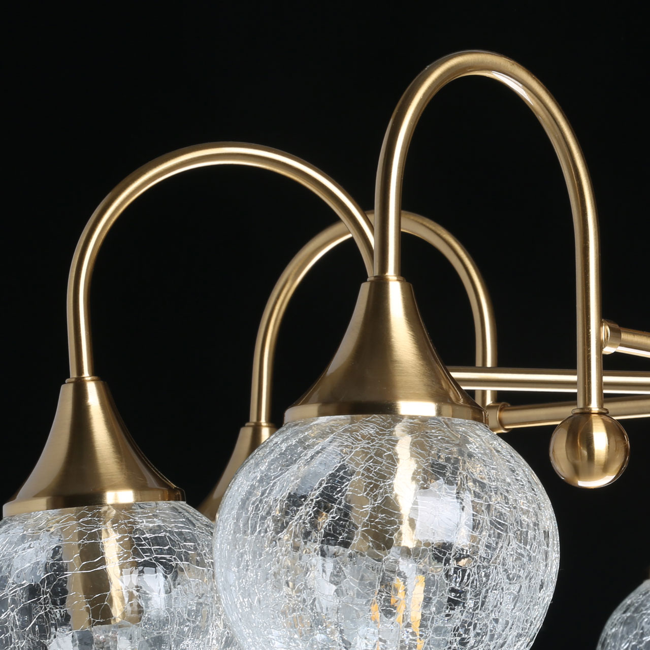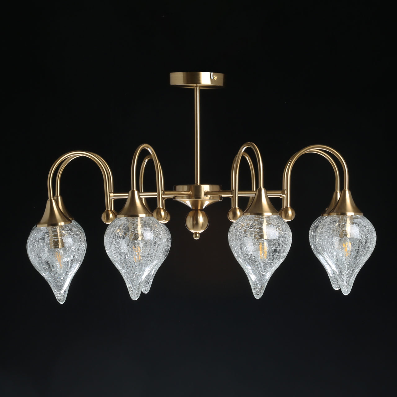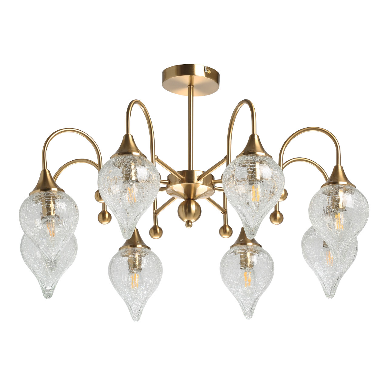 Основание люстры выполнено из металлического сплава и окрашено в матовый оттенок античной бронзы. Тонкая центральная ось переходит в рожки оригинальной формы с бронзовыми круглыми украшениями. Плафоны из кракелированного стекла с эффектом многочисленных трещин-прожилок отлично пропускают свет и равномерно рассеивают его по комнате.