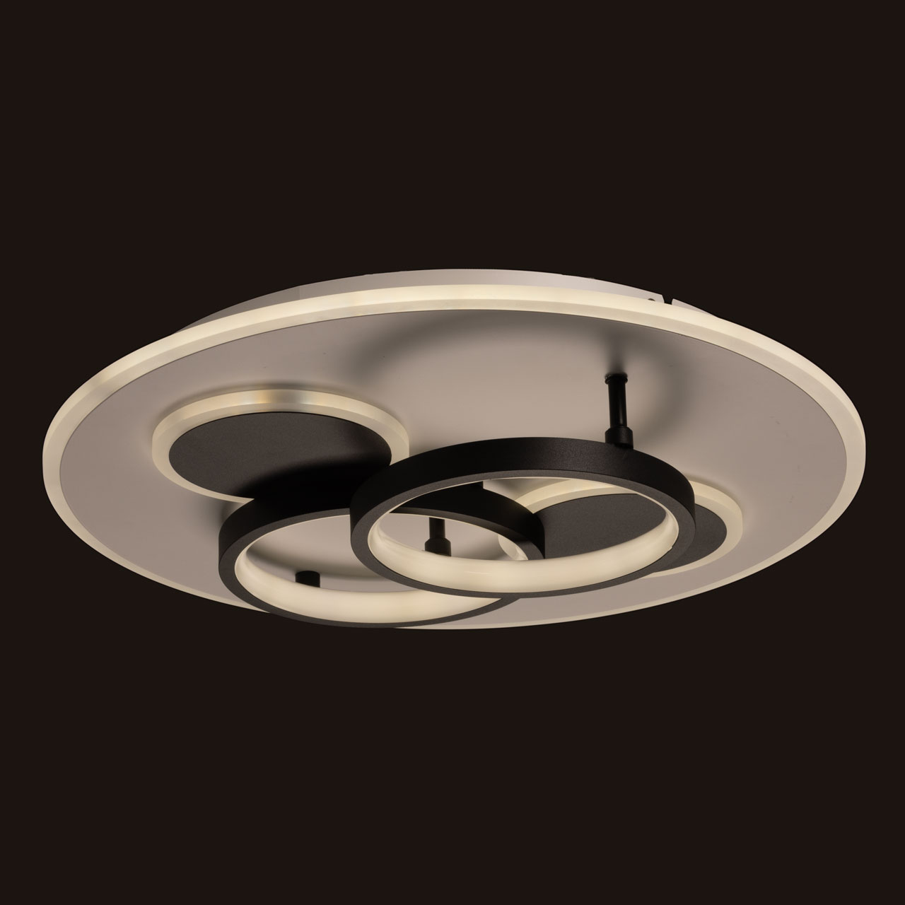 Металлическое основание потолочной люстры окрашено в белый цвет. Корпус плафона выполнен из сплава алюминия с цинком и окрашен в черный цвет. Светодиодные источники света закрыты матовым акрилом.