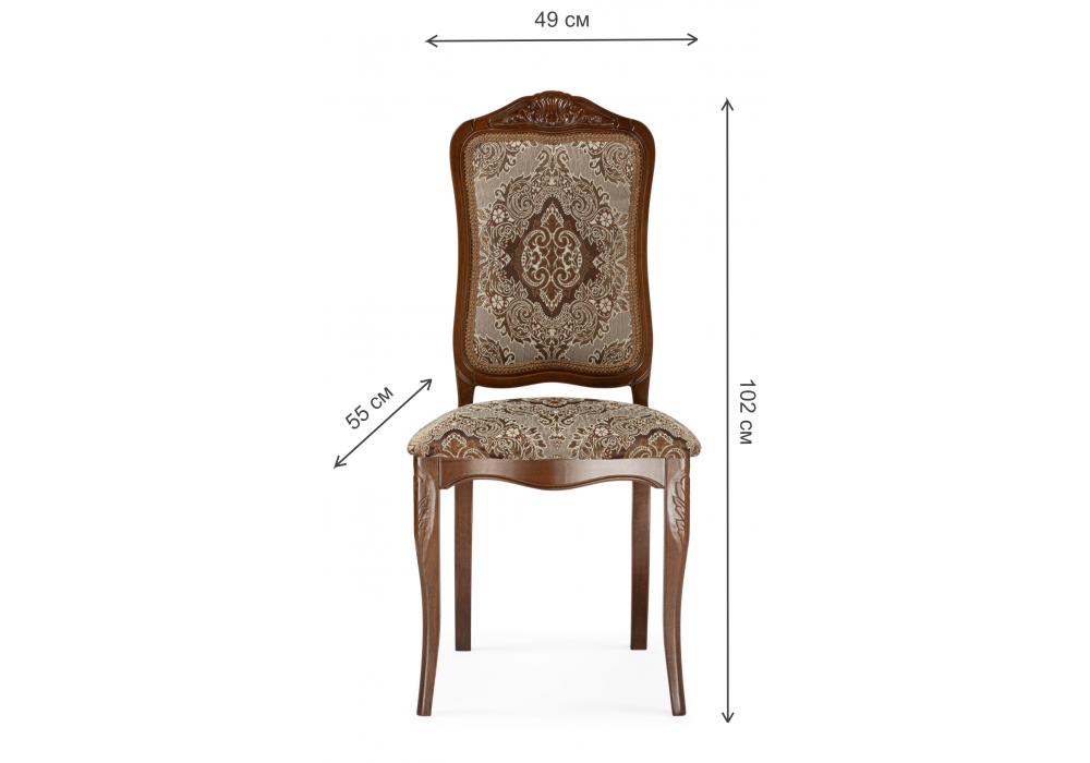 Материал каркаса - массив дерева; Материал сиденья - ткань; Материал обивки - ткань; Ширина - 50; Глубина - 55; Высота - 102; Ширина сиденья - 47; Глубина сиденья - 43; Высота сиденья - 49;