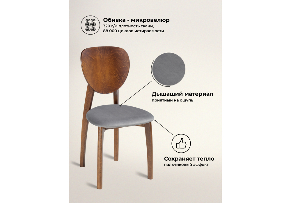Материал каркаса - массив дерева; Материал сиденья - ткань; Материал обивки - ткань; Ширина - 44; Глубина - 50; Высота - 85; Ширина сиденья - 42; Глубина сиденья - 42; Высота сиденья - 46;