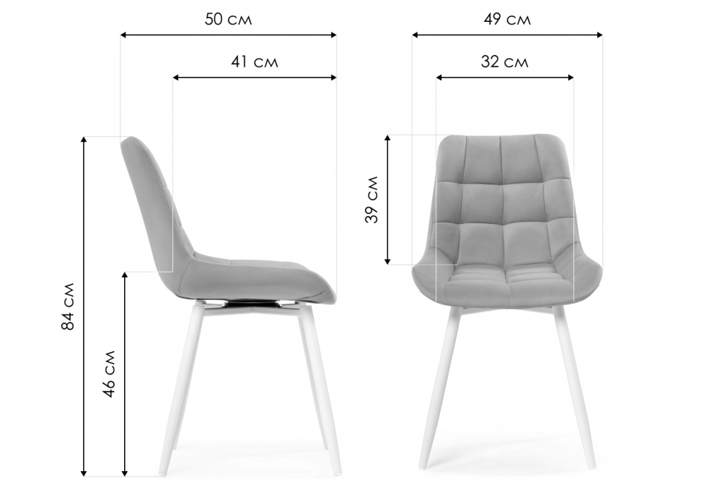 Материал каркаса - металл; Материал сиденья - велюр; Материал обивки - велюр; Цвет ножек - белый; Ширина - 49; Глубина - 50; Высота - 84; Ширина сиденья - 32; Глубина сиденья - 41; Высота сиденья - 46;