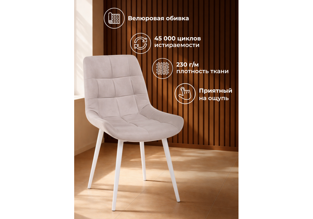 Материал каркаса - металл; Материал сиденья - велюр; Материал обивки - велюр; Цвет ножек - белый; Ширина - 50; Глубина - 60; Высота - 80; Ширина сиденья - 44; Глубина сиденья - 41; Высота сиденья - 48;