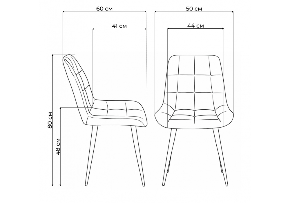 Материал каркаса - металл; Материал сиденья - велюр; Материал обивки - велюр; Ширина - 50; Глубина - 60; Высота - 80; Ширина сиденья - 44; Глубина сиденья - 41; Высота сиденья - 48;