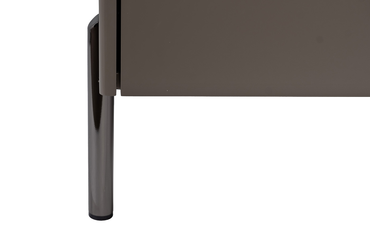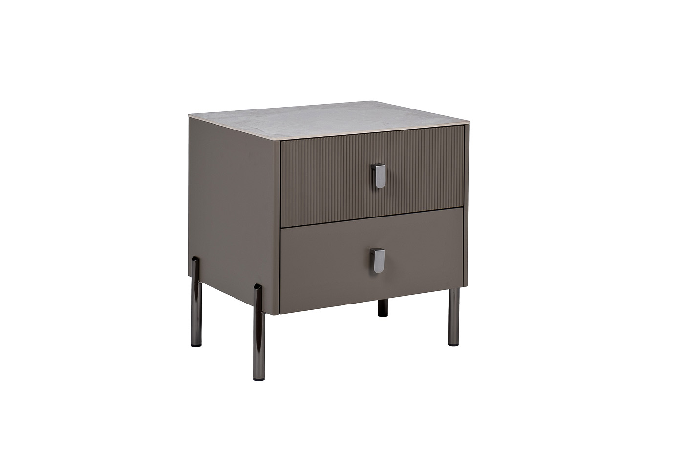 Стильная и лаконичная тумбочка в сером цвете красиво дополнит интерьер спальни, гардеробной или гостиной. Дизайн предмета мебели отличается сдержанностью. Глубокий серый цвет придает изделию благородства, а тонкие ножки позволяют экономить место в помещении. Особенностью этой модели является наличие двух выдвижных ящиков, один из которых имеет абсолютно гладкий фасад, а другой выполнен с эффектом «гофре». Оригинальные металлические ручки дополняют современный стиль тумбочки и позволяют удобно открывать ящики.