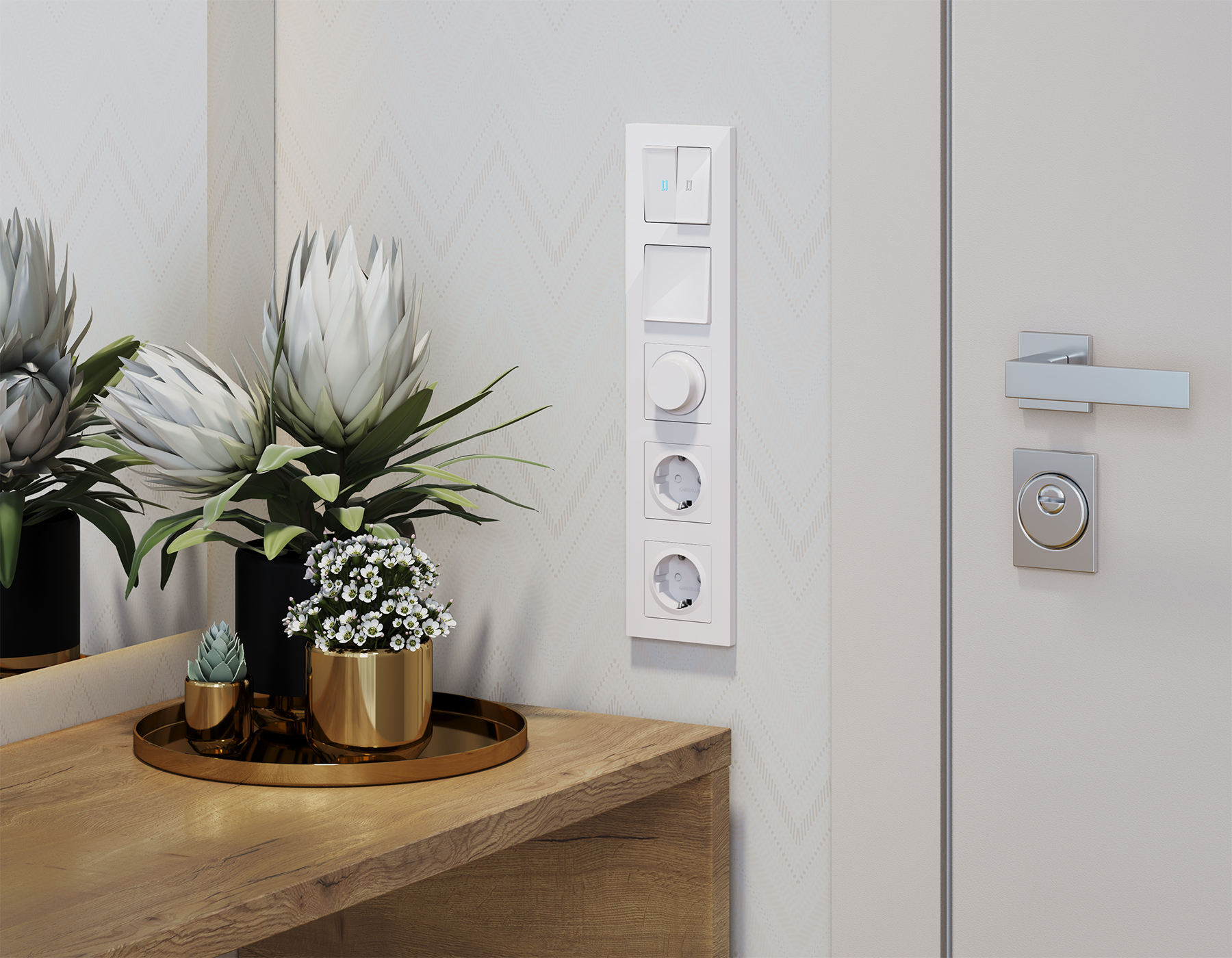 Многогранный ассортимент Ambrella Volt включает в себя механизмы, лицевые панели и рамки, а также комплекты, доступные в различных цветовых решениях. Продукция представлена в модульном исполнении, что позволяет гибко настраивать внешний вид и функциональность. Вам будет легко заменить лицевую панель, рамку или механизм, найдя идеальное сочетание цветов.
